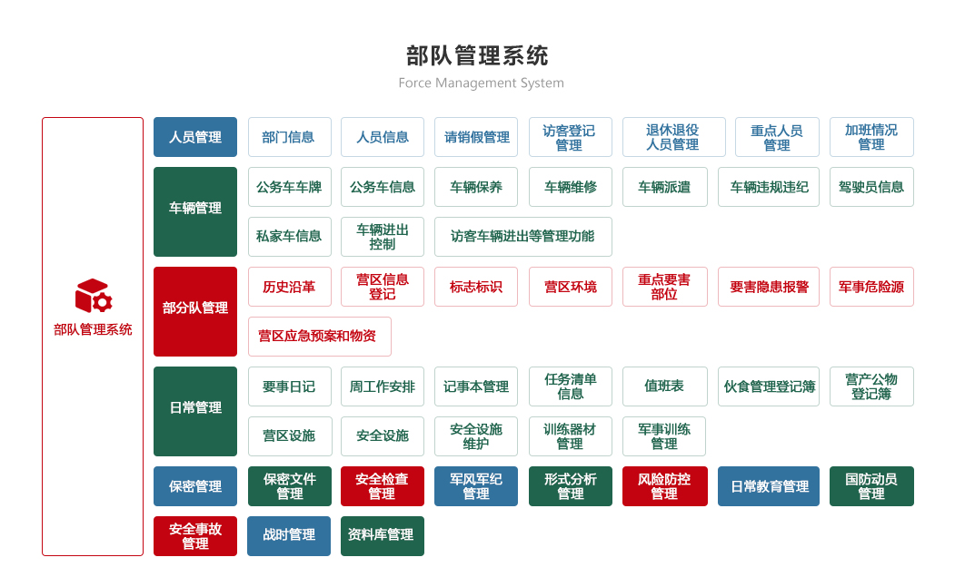 部隊管理系統基于對營區內人、車、dy、崗哨等建設要求,結合軍隊自身特點及應用現狀,實現網絡化管理,提高人、車等管理的效率??梢蕴岣唔憫芰?,構建人、車、q、d、密的全方位綜合管理的部隊系統,保障整體系統高效、穩定、安全運行,提升部隊全面信息化建設層次