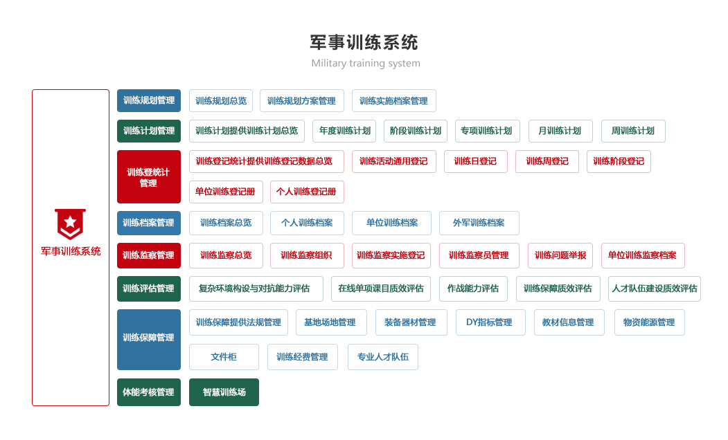 包括訓練計劃、訓練檢查、訓練考核、訓練檔案、訓練資源模塊,實現對訓練計劃制定情況自動統計和智能分析、逐步解決訓練時間、訓練人員落實情況、實現智能報靶和體能訓練監測、實現網上模擬訓練與考核的智能化、自動化和便捷化,對訓練資源科學管理,確保為軍事訓練工作有力支撐。
