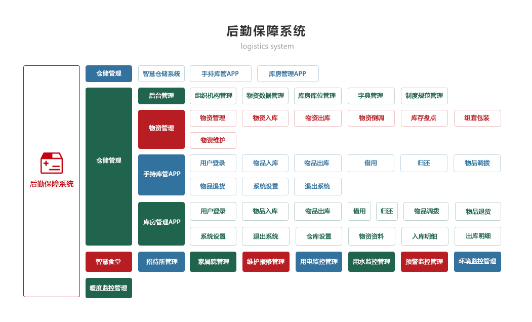 綜合保障系統依托物聯網、RFID識別和傳感技術,著眼作戰精準保障、戰備常態保障和官兵生活保障,對戰備物資、裝備器材、營房物資和被裝物資等的全生命周期的電子化管理,對官兵的健康實時監護。包含財務管理、軍需油運、武器裝備、衛勤管理、營房管理模塊。確保部隊出動,車輛給養油料跟得上,裝備維護情況實時掌握,營房管理工作平時與戰備同步推進。